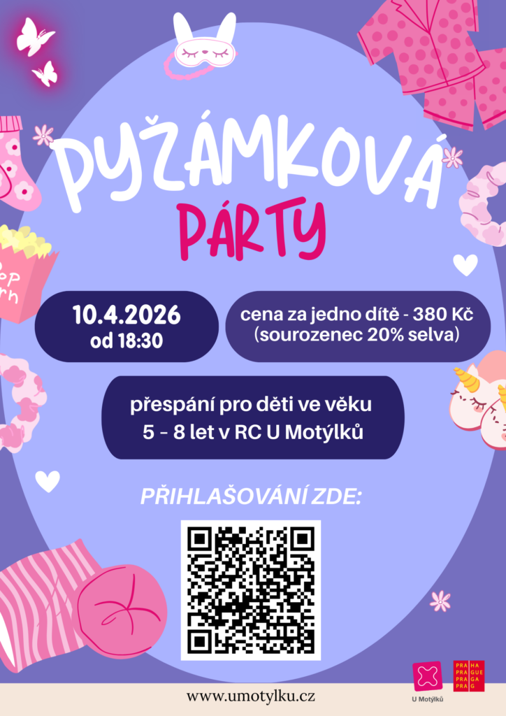 V RC U Motýlků. Přespání pro děti ve věku 5 – 8 let. Pedagogický dozor (2 osoby po celou noc). Vyzvedávání v sobotu do 9:30 STORNO PODMÍNKY: méně než 3 dny před začátkem akce – 100% storno poplatek z celkové ceny méně než 7 dnů před začátkem akce – 50% storno poplatek z celkové ceny 8 dnů a více před začátkem akce a více – 0% storno poplatek z celkové ceny
